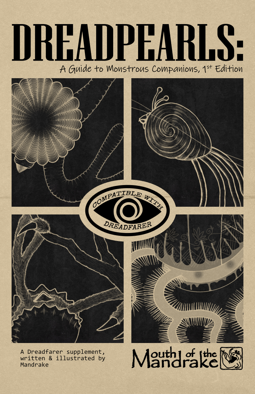 DREADPEARLS: A Guide to Monstrous Companions, is a supplement to the Dreadfarer journaling game by NeonRot and Valdevia, which can be found and purchased here: https://neon-rot.itch.io/dreadfarer