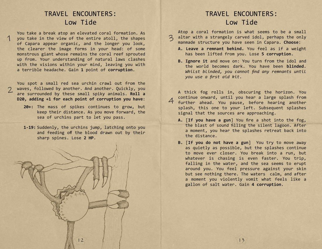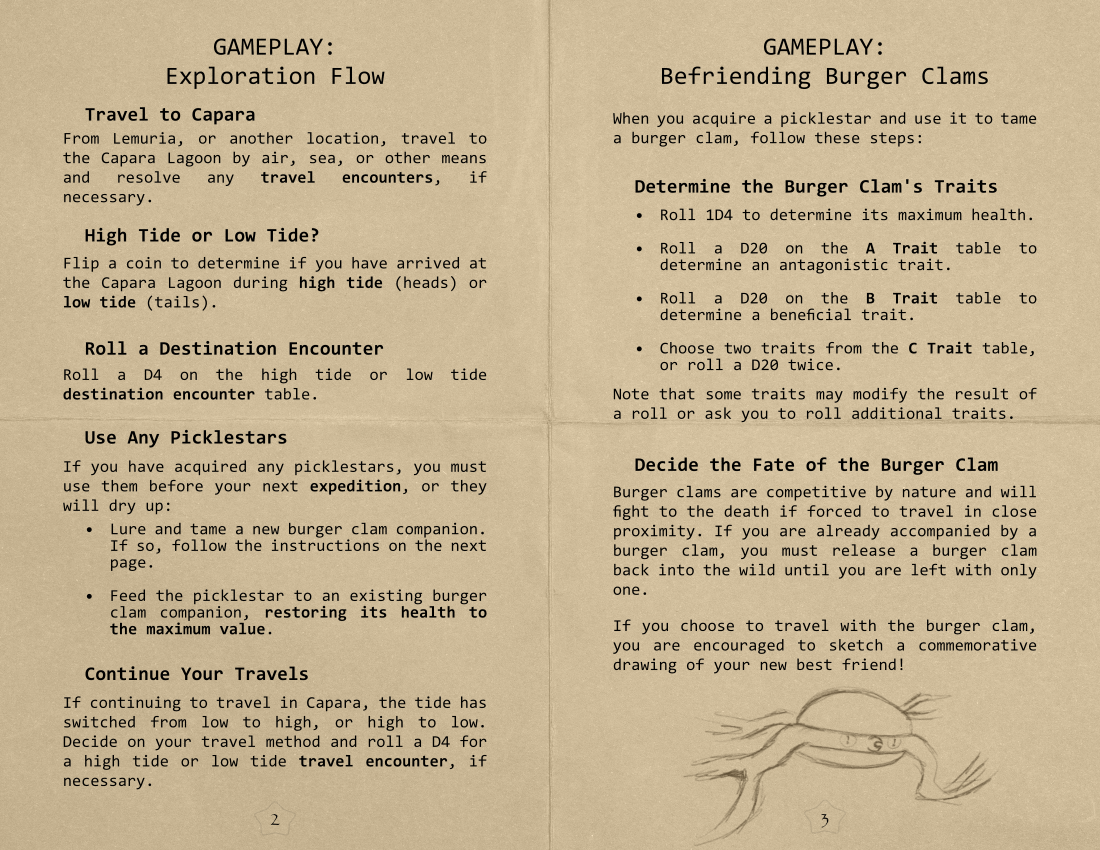 This supplement adds a small area of exploration with unique encounters and the ability to recruit a monstrous travel companion: the "burger clam," which can have two unique abilities from a pool of 40, which can help and hinder your explorer on expeditions.